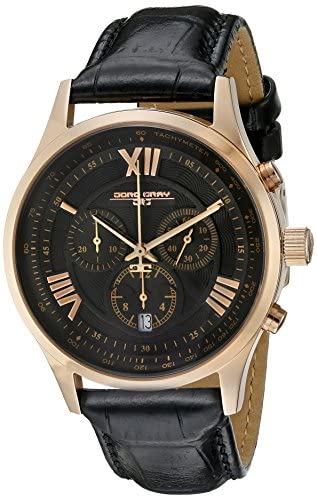 Product Description A classic style watch - 43mm solid stainless steel, rose gold plated case and bezel, features a black patterned dial with rose gold accents, applied index, Ronda 5030D chronograph movement with date display, sapphire coated K1 mineral crystal lens, a black Italian crocodile pattern leather strap with steel buckle. Water resistant up to 5ATM Box Contains Watch, Presentation box, Watch Cushion, Guarantee