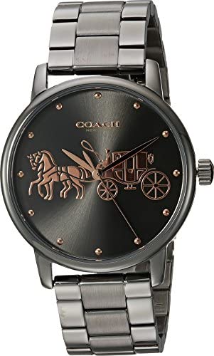 Watch Sizing Guide Please Note: COACH™ items cannot be shipped to military addresses (APO or FPO) and addresses in Hawaii, the Virgin Islands, Guam or any other locations outside of the continental US. The Grand captures the eternal style of New York, the city Coach has always called home. Designed with an ionized plated case and bracelet, this watch features the brand's iconic Horse and Carriage in a contrasting carnation-gold tone. Ionized plated case and bracelet. Quartz movement. Mineral crystal. Deployment clasp closure. Water-resistant to 99 feet. Imported. Measurements: Case Height: 35 9⁄10 mm Case Width: 35 1⁄10 mm Case Depth: 7 9⁄10 mm Band Width: 17 9⁄10 mm Band Circumference/Length: 8 in Weight: 3.2 oz