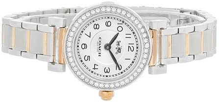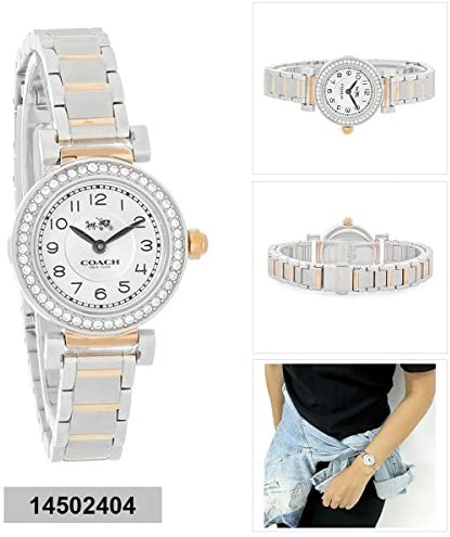 Silver-tone stainless steel case with a silver and rose gold-tone stainless steel bracelet. Fixed- crystal set stainless steel bezel. White dial with black hands and Arabic numeral hour markers. Dial Type: Analog. Quartz movement. Scratch resistant mineral crystal. Pull / push crown. Solid case back. Round case shape. Case size: 23 mm. Water resistant at 30 meters / 100 feet. Functions: hour, minute. Dress watch style. Coach Madison White Dial Ladies Watch 14502404.