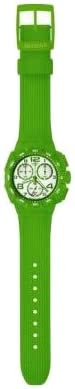 Brand Name Swatch Model number SUIG400 Part Number SUIG400 Item Shape Round Dial window material type Mineral Clasp Buckle Case material Plastic Case diameter 42 millimetres Case Thickness 15 millimetres Band Material Plastic Band width 19 millimetres Band Color Green Dial color white Bezel material Plastic Calendar Date Special features Chronograph Movement Quartz Display Type Chronograph