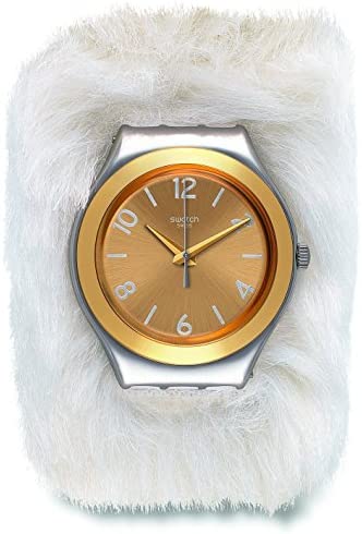Brand Name Swatch Model number YGS130 Part Number YGS130 Model Year 2015 Item Shape Round Dial window material type Plastic Clasp Hook Buckle Case diameter 37.4 millimetres Case Thickness 10.4 millimetres Band Material Leather Band width 17 millimetres Band Color White Dial color Gold Item weight 60 Grams Movement Quartz Display Type Analog
