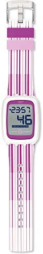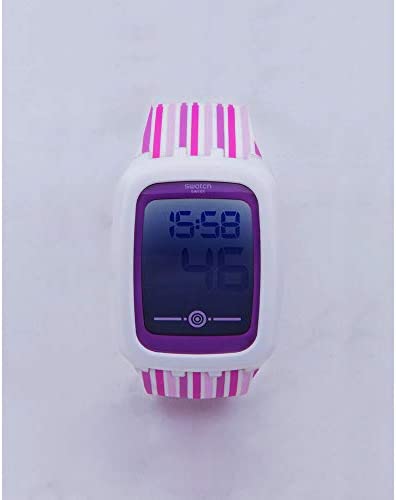 Brand Name Swatch Model number SVQW100 Part Number SVQW100 Case material Plastic Case diameter 39 Case Thickness 11.9 millimetres Band Material Rubber Band Color Multicolour Dial color Gray Special features alarm Movement Quartz Display Type Digital