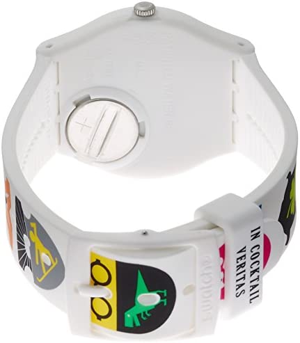 This unisex Swatch Graphistyle watch has a plastic/resin plastic/resin case and is powered by a quartz movement. It is fastened with a white rubber strap and has a pink dial.