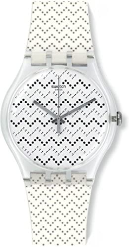 This unisex Swatch Wavey Dots watch has a plastic/resin plastic/resin case and is fitted with an analogue quartz movement. It fastens a white rubber strap and has a multicolour dial.