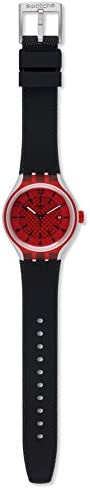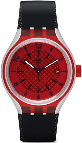 This slim-line unisex Swatch watch has a aluminium case and is fitted with a quartz movement. It is fastened with a black rubber strap and has a red dial. The watch has a date function.