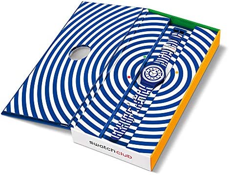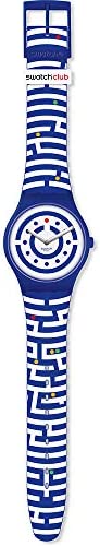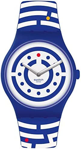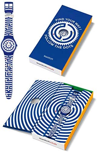 Product Description This follow the dots men's watch from Swatch has a case diameter of 41 mm. The case is made of blue plastic and the bracelet is made of blue and white silicone in labyrinth look with colourful dots. The bracelet is closed with a pin buckle and the water resistance is 3 bar. Box Contains 1 x Watch