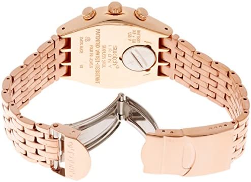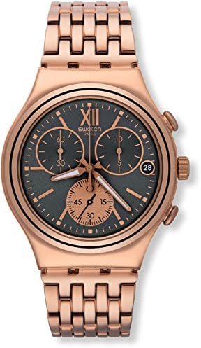This unisex Swatch Irony Chrono watch is made from PVD rose plating and is powered by a chronograph quartz movement. It is fastened with a rose metal bracelet and has a grey dial. The watch has a date function.