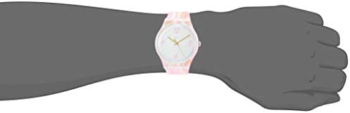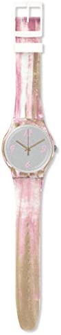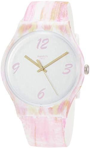 Grey dial enhanced by green hands. Pink (Paint Strokes) plastic case with a pink (paint strokes) silicone band. Quartz movement. 30 meters / 100 feet water resistance. Fixed bezel. Plexiglass crystal. Solid caseback. Tang clasp. Pull / Push crown. Case size 41 mm x 9.85 mm. Band 19.7 mm x 8 incheslong. Swatch SUOW151 Pinkquarelle Watch.