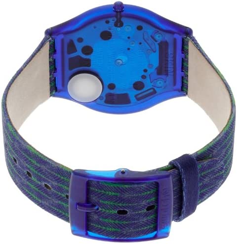 Brand Name Swatch Model number SFS102 Part Number SFS102 Model Year 2014 Dial window material type Plastic Case material Plastic Case diameter 34 millimetres Case Thickness 4 millimetres Band Material Leather Band width 15 millimetres Band Color Blue Dial color Blue Item weight 12 Grams Movement Quartz Display Type Analog