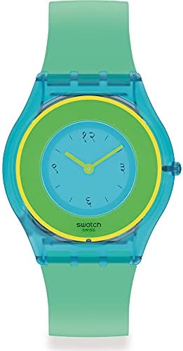 Green and Blue dial. Blue (Translucent) bio-sourced material case with a green silicone band. Quartz movement. 30 meters / 100 feet water resistance. Fixed bezel. Tang clasp. Case size 34 mm x 5.4 mm. Swatch SS08Z100 Swatch X Supriya Lele Watch.