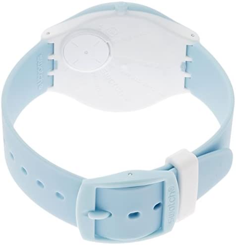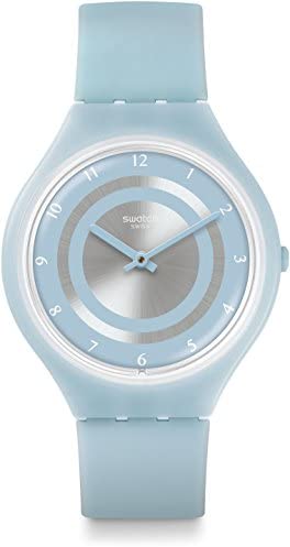 This ultra-slim Swatch Skinciel watch is made from plastic/resin and is powered by a quartz movement. It is fastened with a blue rubber strap and has a silver dial.