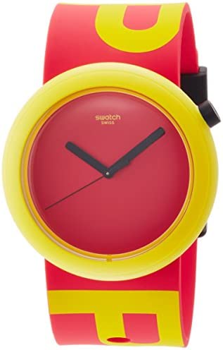 This unisex Swatch Pop-tastic watch has a plastic/resin case and is powered by an analogue quartz movement. It is fitted with a red rubber strap and has a red dial.