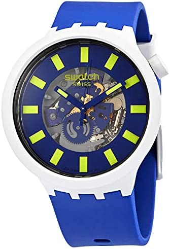 Blue (Skeleton Center) dial enhanced by luminous blue hands. Grey bioceramic case with a matte dark blue (bio-sourced) material band. Quartz movement. 30 meters / 100 feet water resistance. Fixed bezel. Plexiglass crystal. Solid caseback. Tang clasp. Pull / Push crown. Case size 47 mm x 11 mm. Band 19.7 mm x long. Swatch SB03M103 Bioceramic Limy Watch.
