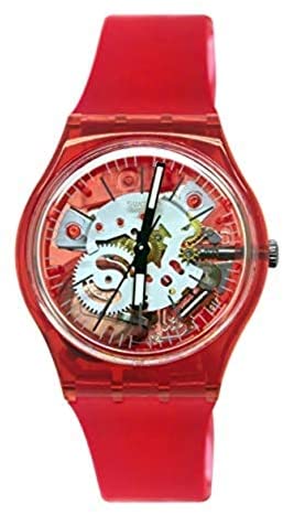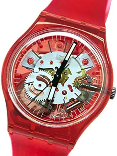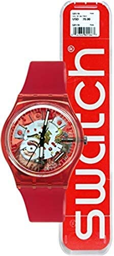 Product Description This Gent lacquered Rosso Bianco men's watch from Swatch has a case diameter of 34 mm. The case is made of plastic and the strap is made of red silicone. The bracelet is closed with a pin buckle and the water resistance is 3 bar. Box Contains 1 Wristwatch