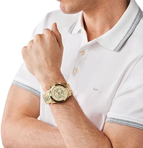 MICHAEL KORS men watch - Round stainless steel case (diam. 45 mm) in polished and brushed gold finishing - 2 gold-tone pushers - 10 ATM water pressure resistance construction -- Stainless steel bracelet in polished and brushed gold finishing - Locking clasp with push button -- Gold-tone dial with luminous indexes, gold-tone arabic numbers at 2/4/6/8/10 and 12 o'clock and inner bezel - Chronograph movement with date and 24h mode - Gold-tone and luminous hands - Mineral glass -- Packed in MICHAEL KORS gift box -- Watch, Presentation box, Watch Cushion, Guarantee