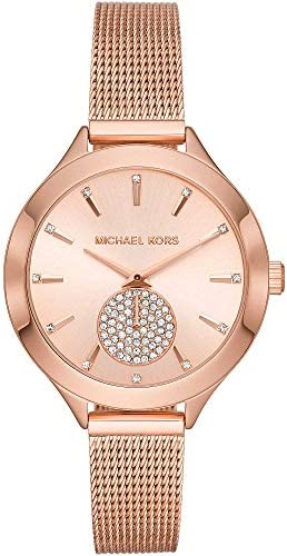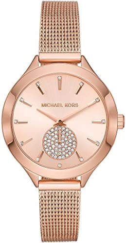 This Michael Kors Slim Runway watch features a rose gold-tone round case, a tonal dial with a pavé subdial and sleek mesh bracelet.