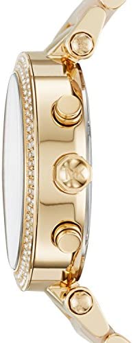 Product Description This Michael Kors Parker watch exudes glamour. Polished gold-tone links alternate on the bracelet with pink acetate centre links, and the signature logo dial is accented with pave crystals on the indexes and topring. Box Contains Watch, packaging and warranty booklet
