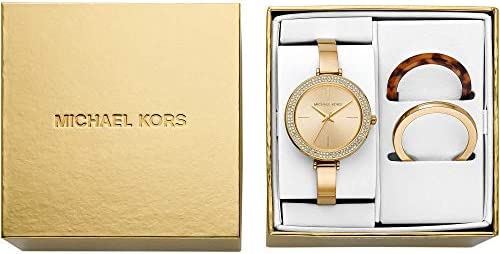 Michael Kors' Carey 36mm watch features a gold sunray dial with stick indexes, interchangeable glitz, gold-tone stainless steel and tort acetate toprings, three-hand movement and gold-tone stainless steel half bangle.