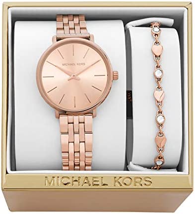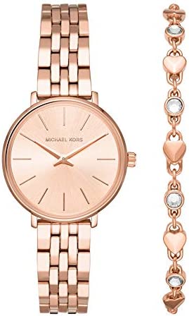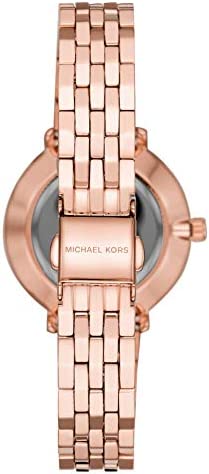 32mm case, 16mm band width, mineral crystal, Quartz movement with 2-hand analog display, imported -- Round stainless steel case, with a rose gold dial -- Rose Gold, stainless steel bracelet -- Water resistant up to 50m: Wearable while swimming in shallow water
