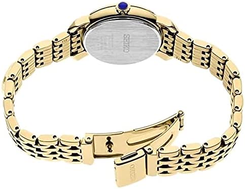 Seiko watch woman SUR626P1 gold finish stainless steel blue Roman numerals. Woman. Case: Stainless steel. Bracelet: Stainless steel. Movement: Japanese Quartz. Crystal: Hardlex. Box Diameter (mm): 29.2. Box Thickness: 8. Resistance: 5 atm. Closing: folding double switch.