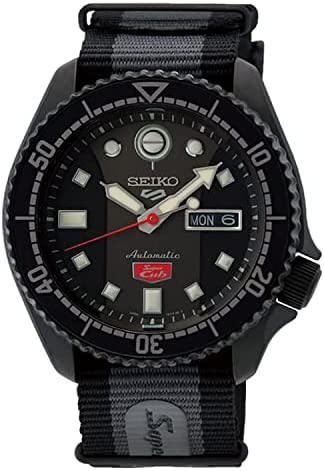 Limited edition of 5,000 pieces worldwide, distinctive automatic watch for men from the Seiko 5 Sports series, mechanical automatic movement calibre 4R36, 24 bearing stones, with automatic winding on both sides ("magic lever"), power reserve approx. 41 hours, manual winding possible, second stop, date and day display, black/anthracite dial, distinctive hands and indices with LumiBrite, LumiBrite glows for a long time and very bright, central second hand, matte stainless steel case with titanium carbide pad, rotatable on one side. black black bezel with black bezel with Minute scale, screwed glass case back with view of the movement, engraved serial number, ribbed crown at the "4" with edge protection and logo sign, robust Hardlex glass (tempered mineral glass), black textile NATO strap with grey stripes, matte pin buckle with logo, waterproof up to 10 bar. up Width: 42.5 mm, height: 13.4 mm