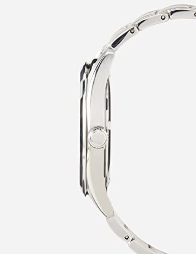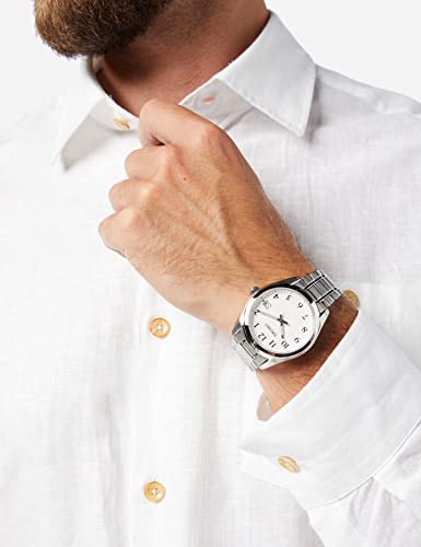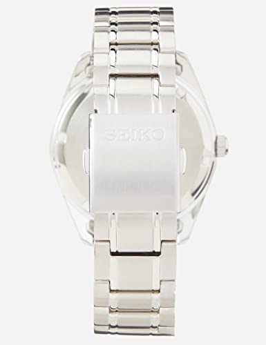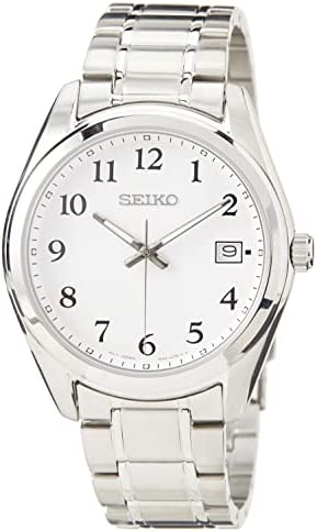 Seiko men's quartz watch with white dial, complemented by luminescent hands and a silver stainless steel bracelet. Water resistant up to 100 metres.