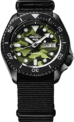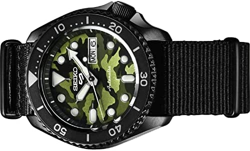 Seiko 5 Sports SKX Limited Edition Watch with Camouflage Dial and Black Canvas Strap SRPJ37K1First released in the 90s, the SKX Seiko 5 Sports watches were a modernised version of the classics – updating the reliability and durability of the 1960s originals. This “camouflage green dial takes inspiration from today’s street fashion enthusiasts and features a pressed camouflage pattern. The dial has a richer texture and a changing impression, visible from different angles thanks to a pressed pattern—not a printed one. The watch is fitted with a black nylon strap to enhance the camouflage street style aesthetic.