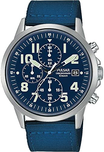 Pulsar Men's Military Watch Blue Nylon Strap Mineral Glass Stainless Steel Case Blue Dial 10ATM Waterproof with Luminous Numerals and Hands and Date Display and 1/10 Seconds Chronograph