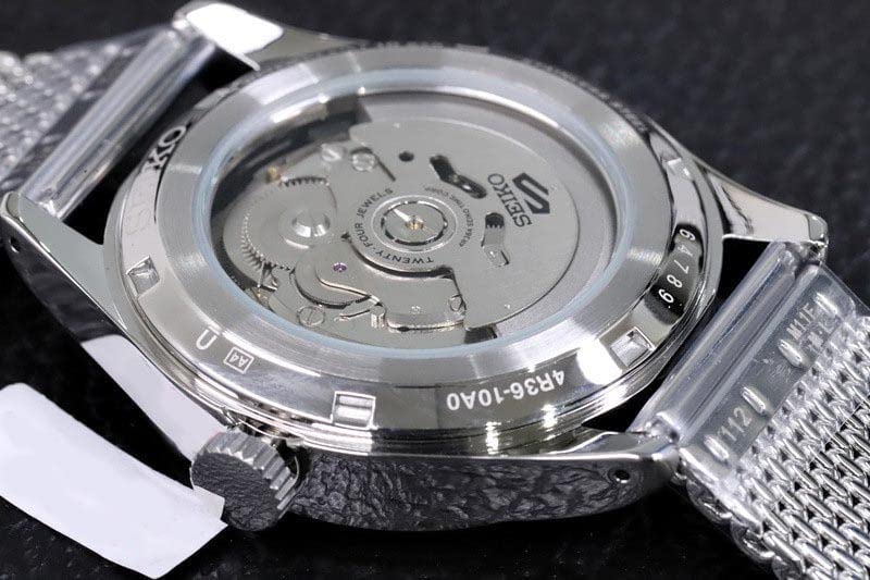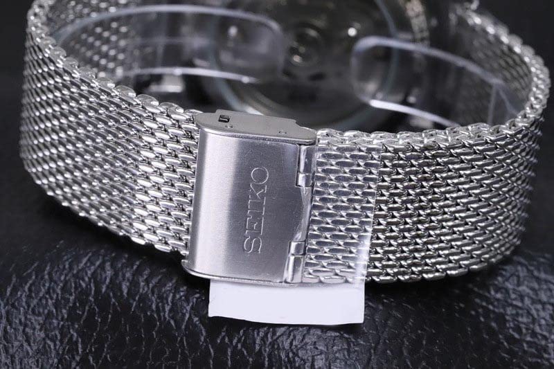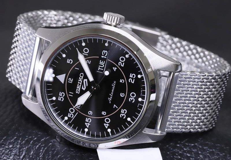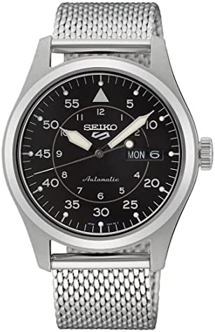 Seiko 5 Automatic Black Dial Milanese Bracelet Men's Watch SRPH23K1 The Case: Seiko 5 Sports Military SRPH23K1 Milanese Bracelet Men's Watch is made from stainless steel and it measures 40mm in diameter. The watch’s design adheres to the classic aesthetics of a military watch. The circular case and the fixed bezel have been brushed giving it a matte and scratch-resistant appearance, while a recessed push-pull crown is positioned at the 3 o’clock mark. Hardlex glass has been applied to both the front of the case and the exhibition case back. The Dial: The dial comes presented in a black and it exhibits an uncomplicated design that ensures optimum levels of readability. Around the outer edge of the dial, there is a 60-minute scale that is separated by increments of five minutes, besides them are small luminescent pips which enable the dial to be read in the dark. The 12-hour scale is displayed through Arabic style numerals within the inner dial. A day-date display window is presented neatly besides the 3 o’clock marker. An bold syringe style handset occupies the centre of the dial, it has been filled with luminescent material. The Seiko 5 logo is presented neatly in silver beneath the 12 o’clock marker. The Bracelet: The Milanese style silver bracelet is made out of mesh stainless steel. It fastens securely through the use of a three fold deployment clasp. The Functions: Seiko’s exclusive 4R36 calibre automatic movement powers this watch, it consists of 24 jewels and it offers an accuracy of -25/+45 seconds per day. This watch has a water resistance of 100 metres, meaning it can be worn when snorkeling.
