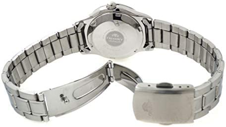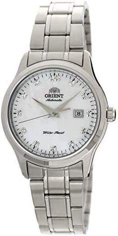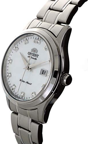 Orient NR1Q004W Charlene automatic women's watch features a 31mm wide and 12mm solid stainless steel case with textured push/pull crown. Orient NR1Q004W is powered by an accurate Japanese Orient Caliber 55741 automatic movement. This beautiful watch also features an attractive white mother of pearl dial with silver tone hands and crystal hour markers, date function, protected by scratch resistant hardlex crystal, and water resistant depth is 50 meters. Orient NR1Q004W is equipped with a solid stainless steel bracelet with fold over clasp. Orient NR1Q004W Women's Charlene stainless steel white dial automatic crystal watch is brand new and comes in an original Orient gift box and is backed by an 1 year manufacturer warranty.