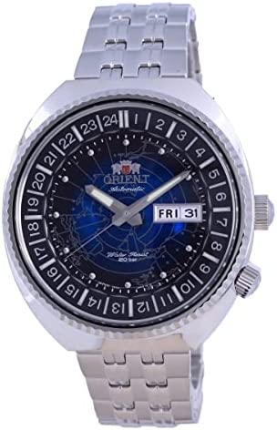 Blue dial enhanced by silver-tone hands. Silver-tone stainless steel case with a silver-tone stainless steel band. Automatic movement. 200 meters / 660 feet water resistance. Bi-directional Rotating bezel. Scratch Resistant Mineral crystal. Solid caseback. Deployment with Push Button Release clasp. Screw Down crown. Case size 43.5 mm. Orient RA-AA0E03L09C World Map Revival Watch.