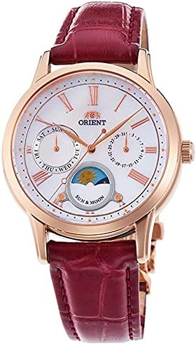 Product description Orient Sun and Moon RA-KA0001A10B Women's Multifunction Watch Stainless steel case, rose gold plating, polished Leather strap, red, folding clasp. Quartz movement, battery operated. Time of day display (sun/moon), day of the week display, date display. Dial colour mother of pearl white. 5 bar water resistant. Case width: approx. 34 mm Case height: approx. 8mm Comes with box. Directions Adults