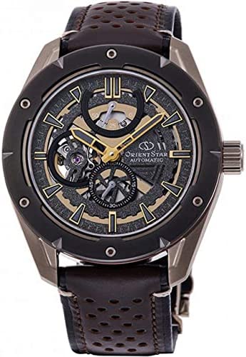 Black (Skeleton) dial. Silver-tone stainless steel case with a brown leather band. Automatic movement. 100 meters / 330 feet water resistance. Fixed bezel. Fold Over clasp. Case size 43.2 mm x 13.7 mm. Orient RE-AV0A04B00B Orient Star Watch.