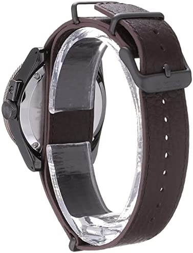 Brown grain leather bracelet with a silver pin buckle. Stainless steel case in dark silver with a diameter of 40 mm and second display on the bezel. Brown dial with line index and three hands with luminous function, separate dial and a clear cut-out that shows the watch interior. The watch has a water resistance of 5 bar (it is suitable for everyday use such as B. bathing, showering or washing hands). The movement is an automatic movement, winding by movement