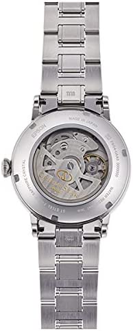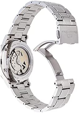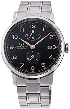Black dial enhanced by rose gold-tone hands. Silver-tone stainless steel case with a silver-tone stainless steel band. Automatic movement. 50 meters / 165 feet water resistance. Fixed bezel. Scratch Resistant Sapphire crystal. Transparent caseback. Fold Over with Push Button Release clasp. Pull / Push crown. Case size 38.7 mm x 12.5 mm. Band 20 mm x long. Orient RE-AW0001B00B Star Watch.