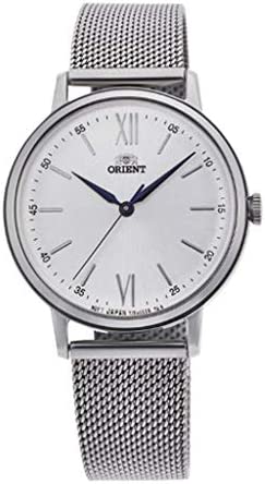 Silver dial enhanced by blue alpha-style hands. Silver-tone stainless steel case with a silver-tone stainless steel mesh band. Quartz movement. 50 meters / 165 feet water resistance. Fixed bezel. Scratch Resistant Mineral crystal. Solid caseback. Fold Over Slip Through clasp. Pull / Push crown. Case size 33.8 mm x 7 mm. Band 14 mm x long. Orient RA-QC1702S10B Clic Watch.