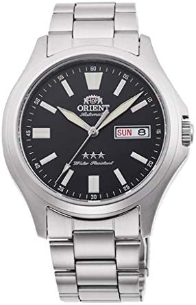 Black dial enhanced by luminous silver-tone sword-shape hands. Silver-tone stainless steel case with a silver-tone stainless steel band. Automatic movement. 30 meters / 100 feet water resistance. Fixed bezel. Scratch Resistant Mineral crystal. Solid caseback. Deployment with Push Button Release clasp. Pull / Push crown. Case size 39 mm x 11.2 mm. Band 20 mm x long. Orient RA-AB0F07B19B Tri Star Watch.