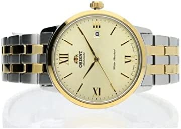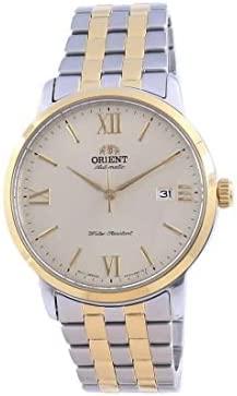 Champagne dial enhanced by yellow gold-tone hands. Silver-tone stainless steel case with a two-tone (silver-tone and yellow gold-tone) stainless steel band. Automatic movement. 50 meters / 165 feet water resistance. Fixed bezel. Scratch Resistant Sapphire crystal. Solid caseback. Fold Over clasp. Pull / Push crown. Case size 42 mm x 12 mm. Band 22 mm x long. Orient RA-AC0F08G10B Contemporary Watch.