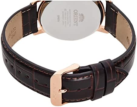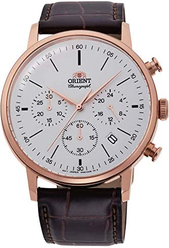 Dark brown grain leather strap with a rose gold pin buckle. Rose gold stainless steel case with a diameter of 42 mm. White dial with line index, three rose gold hands, three separate dials, date display, and Orient logo. The watch has a water resistance of 5 bar (it is suitable for daily use such as B. bathing, showering or washing hands). The movement is a Japanese quartz movement.