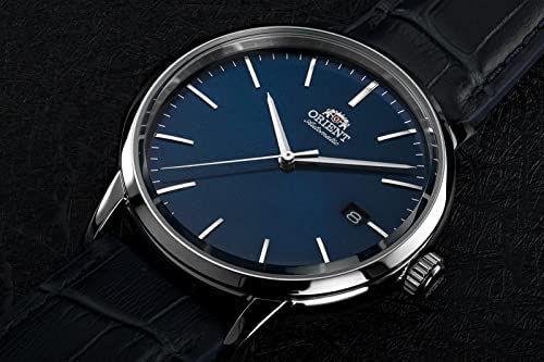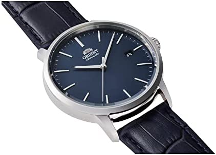 Silver-tone stainless steel case with a black leather strap. Fixed silver-tone stainless steel bezel. Blue dial with silver-tone hands and index hour markers. Minute markers around the outer rim. Dial Type: Analog. Date display at the 3 o'clock position. Automatic movement. Scratch resistant mineral crystal. Pull / push crown. Solid case back. Round case shape, case size: 40 mm, case thickness: 13 mm. Band width: 20 mm. Tang clasp. Water resistant at 100 meters / 330 feet. Functions: date, hour, minute, second. Casual watch style. Orient Contemporary Automatic Blue Dial Men's Watch RA-AC0E04L10B.
