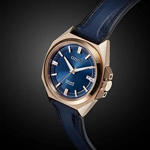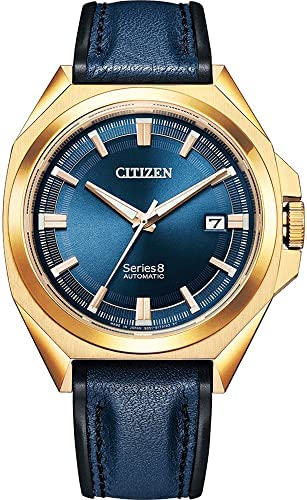 Strong and elegant, stylish and confident. The newly relaunched Citizen Series 8 mechanical collection of modern timepieces makes an unforgettable impression with sophisticated designs and advanced automatic movements. The richly detailed 831 mechanical timepiece features a superior accuracy of -10 to +20 per day in a luxurious, gold-tone stainless case and blue calfskin leather strap, a glossy blue dial with luminous hands and markers, and an anti-reflective sapphire crystal. This modern Citizen automatic men’s dress watch also features enhanced magnetic resistance to protect the movement against external magnetic fields, a 42-hour power reserve and water resistance to 100 meters. Caliber number 9051.