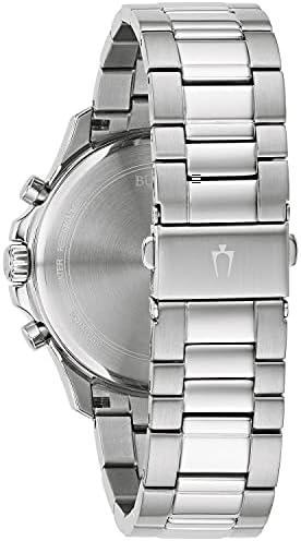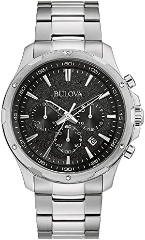 From the Bulova Men's Classic Collection. A six-hand chronograph with stainless steel case and bracelet and black dial with calendar window. Watch features a flat mineral crystal, quartz movement, and water resistance to 30 meters.