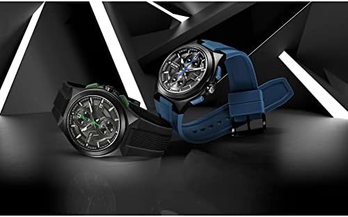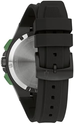 Make a bold statement with the sporty, new Maquina timepiece – guaranteed to stand out on any wrist. The modern design with a rugged edge features a black ion-plated stainless steel case and dark gray and black dial with green accents that showcases the 5-hand chronograph movement and calendar on a matte black silicone strap. It also features a sapphire crystal and water resistance to 100 meters. This distinctive men’s Maquina watch offers a new twist on a bold chronograph that is essential for your sport style.