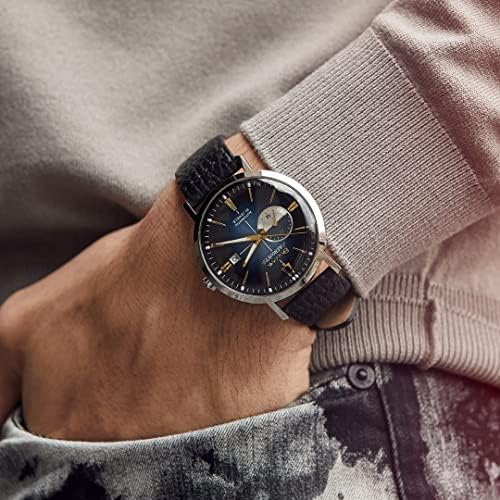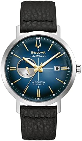 Bulova's new automatic models in the Aerojet collection bring a contemporary flair to this classic watch inspired by vintage timepieces. The striking blue dial includes gold-tone accents and a bi-colour day night indicator. The signature cross-hair detail is enhanced with an ombre effect radiating from a pale colour at the centre to a rich dark blue at the edges. The vintage Aerojet logo adds an authentic retro feel to the timepiece. The case is stainless steel, with a screw-back featuring a mineral crystal exhibition window. The look is enhanced with a supple black leather strap for a rich elegance that will stand out. This sophisticated watch is destined to become a favourite in any collection.