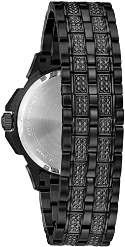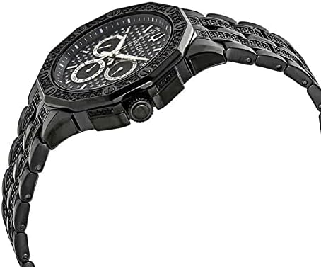 Multi-function dress watch boldly embellished with 300 crystals on the black tone stainless steel case and bracelet with a pave set black dial. Water resistance to 30 meters.