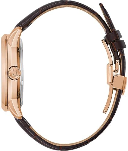 The Sutton automatic men’s watch from Bulova features a sophisticated design with a full exhibition dial and case-back. The rose-gold-tone stainless steel screw-back case has a “skeletonized” black three-hand dial with rose-gold-tone hands and markers, revealing the intricate workings of the self-winding 21-jewel automatic movement. It is paired with a brown alligator grain leather watch strap, finished with a push-button deployant buckle. The entire watch is also water resistant up to 30 meters. This distinctive automatic watch is an excellent addition to any collection.
