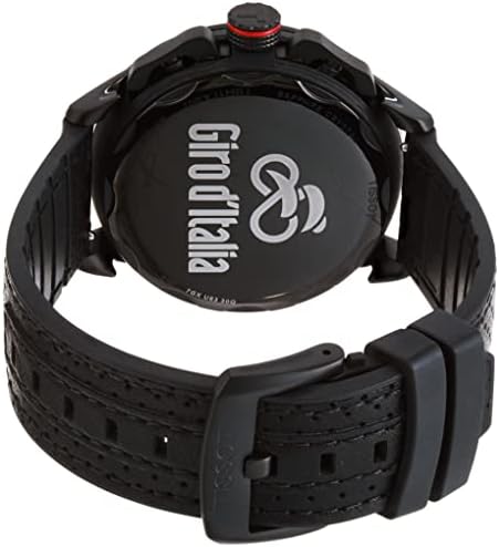 Tissot watch man Giro D'Italia 2022 Special Edition T-Race Cycling chronograph black T135.417.37.051.01. Watch with black PVD steel case with dimensions of 45 mm and thickness of 11.6 mm with carbon composite. Black polished and satin finish stainless steel ferrule. Black dial with antigraphy sapphire crystal with anti-glare treatment. Back engraved with Giro d'Italia logo. Swiss ETA G10.212 quartz movement with a caliber of 29.8 mm. Gauge 13 1/4" with 4 jewels. EOL functions (battery end-of-life indicator), central 60-seconds chronograph hand, 30-minutes and 1/10 of a second counters, ADD and SPLIT functions. Black embossed cow leather strap with buckle closure. Distance from lugs of 22 mm. Water resistance of 10 bar.