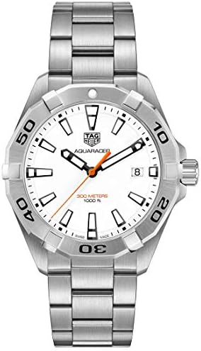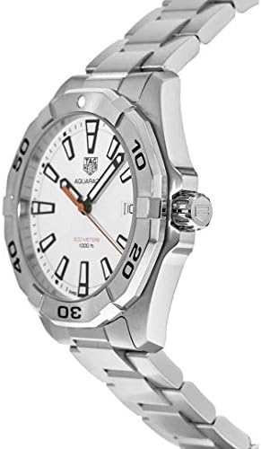 White dial enhanced by luminous black hands. Silver-tone stainless steel case with a silver-tone stainless steel band. Quartz movement. 300 meters / 1000 feet water resistance. Uni-directional Rotating bezel. Scratch Resistant Sapphire crystal. Solid caseback. Fold Over clasp. Screw Down crown. Case size 41 mm x 12 mm. Band 20 mm x long. Tag Heuer WBD1111.BA0928 Aquaracer Watch.