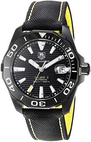 - With Manufacturer Serial Numbers- Black Dial with Yellow Accents- Date Feature- Self Winding Automatic Movement- TAG Heuer Caliber 5- Guaranteed Authentic- Certificate of Authenticity- Black Titanium Case- Black Textile Fabric Strap with Yellow Stitching- Scratch Resistant Sapphire Crystal- Manufacturer Box & Manual- 300 Meters / 1000 Feet Water Resistant- 41mm = 1 5/8" Case, 7" Adjustable Strap- Uni-Directional Rotating Bezel- Luminescent Hands & Markers- Screw Down Crown & Caseback- Deployment BuckleAlso Known As Model # WAY218AFC6362 / WAY218A FC6362
