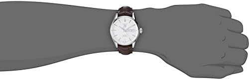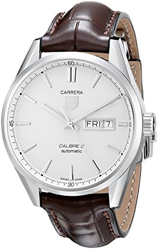 Stainless steel case with a brown alligator leather strap. Fixed stainless steel bezel. Silver dial with luminous silver-tone hands and index hour markers. Minute markers around the outer rim. Dial Type: Analog. Luminescent hands and markers. Day of the week and date display at the 3 o'clock position. Automatic movement. Scratch resistant mineral crystal. Pull / push crown. Transparent case back. Case diameter: 41 mm. Case thickness: 12 mm. Round case shape. Band width: 22.9 m. Band length: 9 inches. Fold over clasp with push button release. Water resistant at 100 meters / 330 feet. Dress watch style. Tag Heuer Carrera Silver Dial Brown Leather Mens Watch WAR201BFC6291.